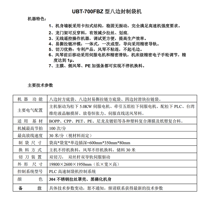 UBT-700FBZ型八边封制袋机